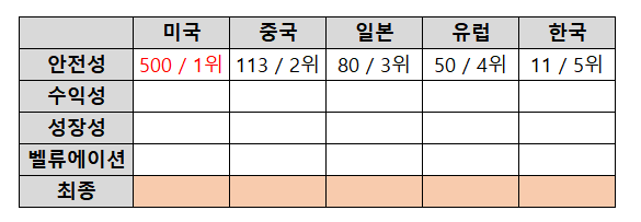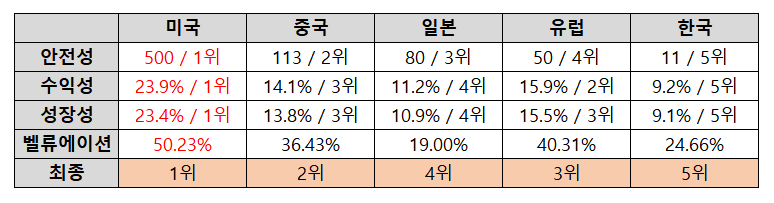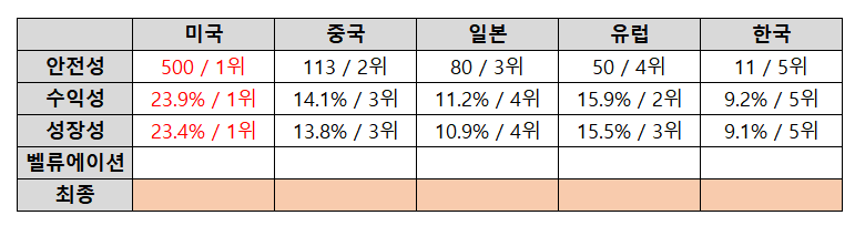 안전성, 수익성, 성장성 위 세 가지 모든 기준에서 미국이 압도적 1위입니다. 반대로 한국의 경우 압도적 꼴찌네요.
