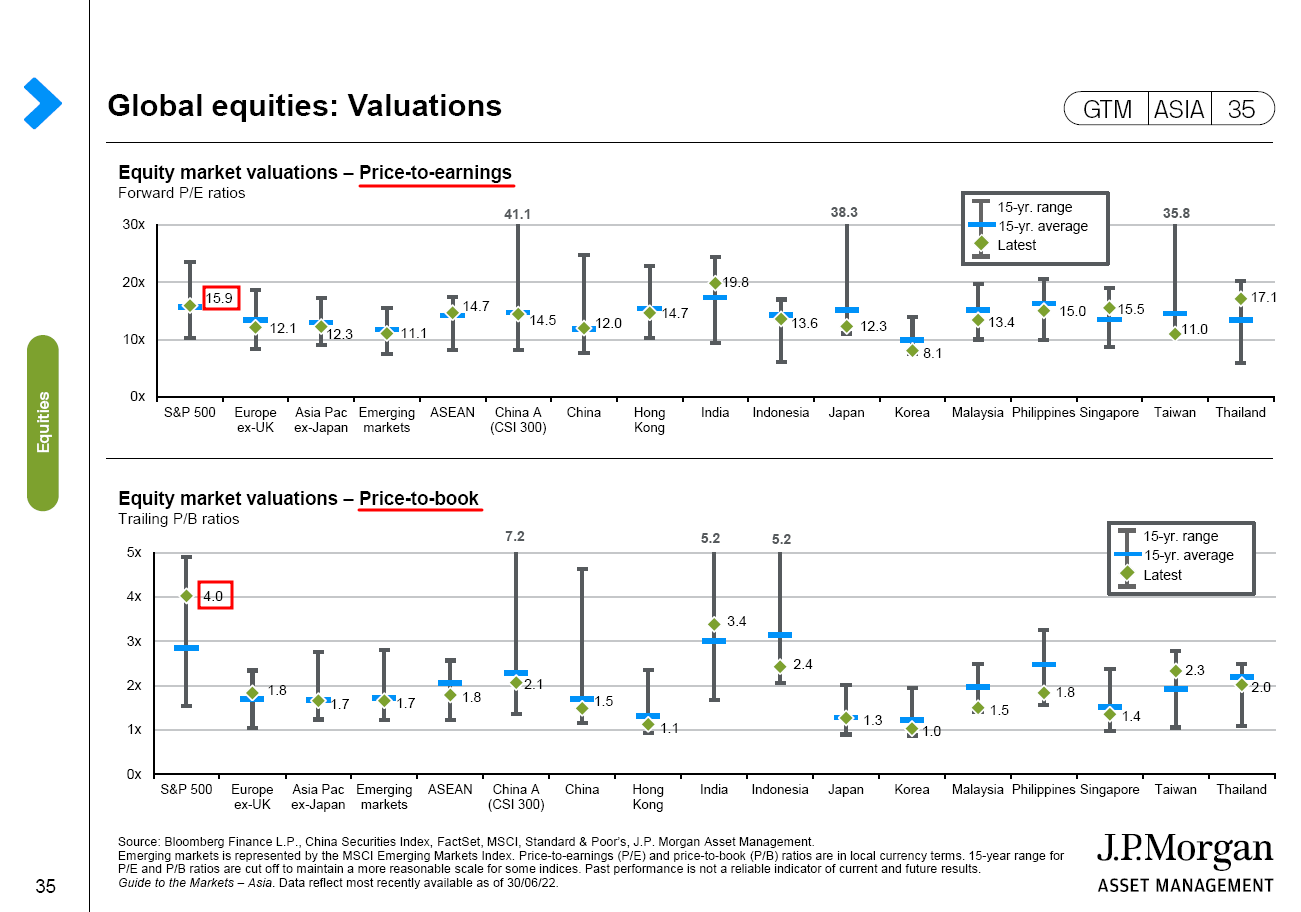 과거 15년 주요국 PER와 PBR 평균 및 현재 수치 - J.P.Morgan Guide to the Market 2022.3Q_ ASIA 과거 15년 주요국 PER와 PBR 평균치입니다. 미국만 보겠습니다.