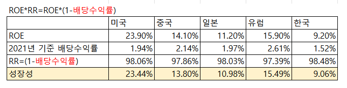 이렇게 얻은 배당수익률과 ROE를 토대로 성장성을 계산해보면 다음과 같습니다.