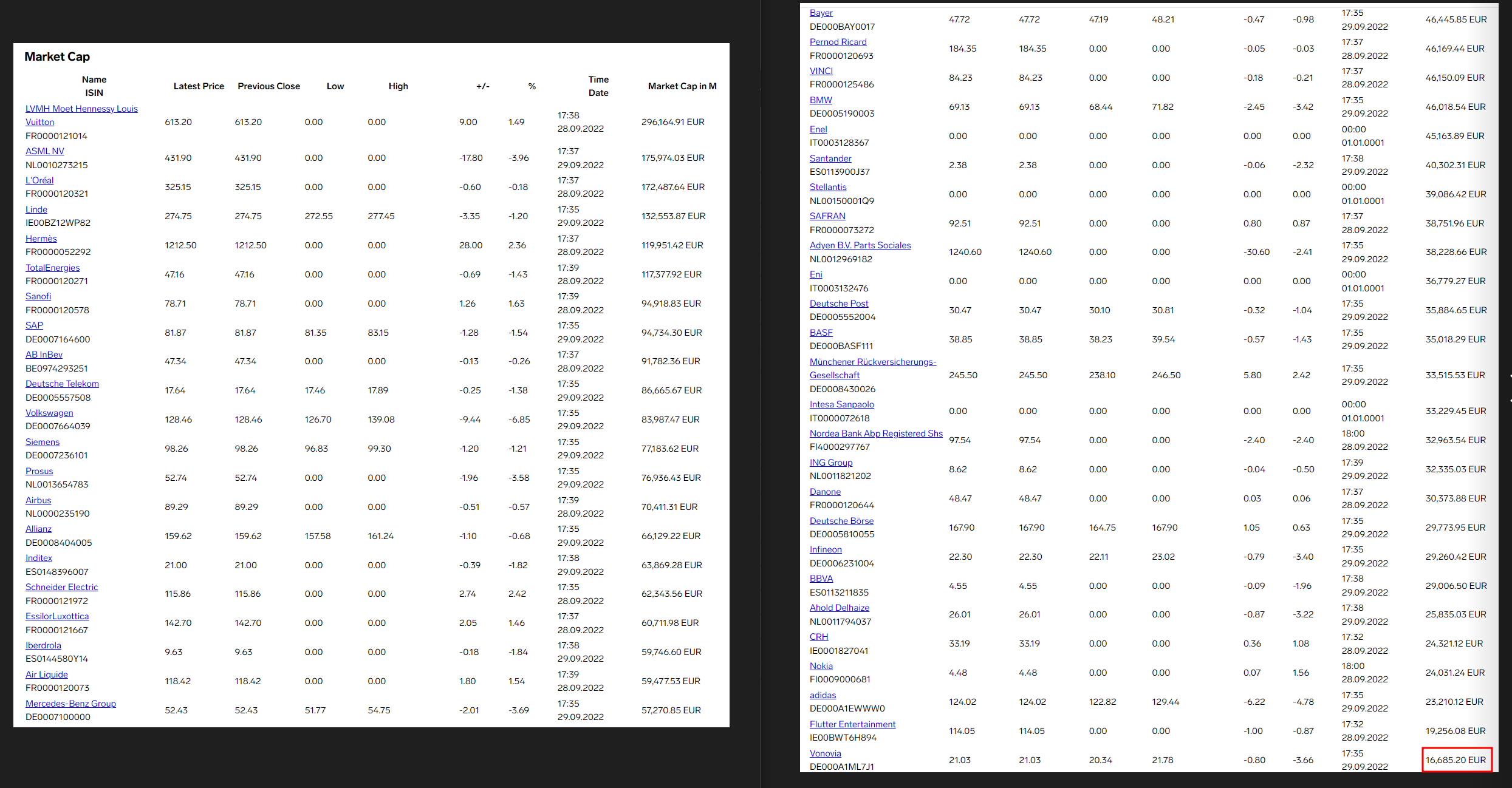 유로스톡스50의 시가총액 순위 - markets.businessinsider.com 흥미롭게도 유로스톡스50 지수의 50위 기업의 시총이 약 20조 정도입니다. 즉, 유로스톡스 기준 유럽은 50개 정도의 기업이 있다고 보시면 됩니다. 유럽도 만만치 않죠?
