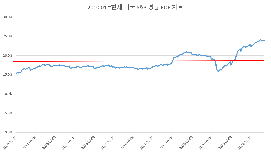 2010.01 ~현재 미국 S&P 평균 ROE 차트(빨간선 = 과거 15년 평균 ROE 18.8%) 2010년 이후 ROE 추이를 그래프로 보면 더욱 현재가 얼마나 높은 수준인지 느끼실 수 있을 겁니다.