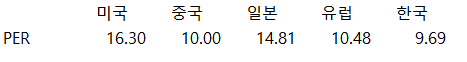 9월 16일 기준 블룸버그 데이터를 참고하니 국가별 PER는 다음과 같습니다.